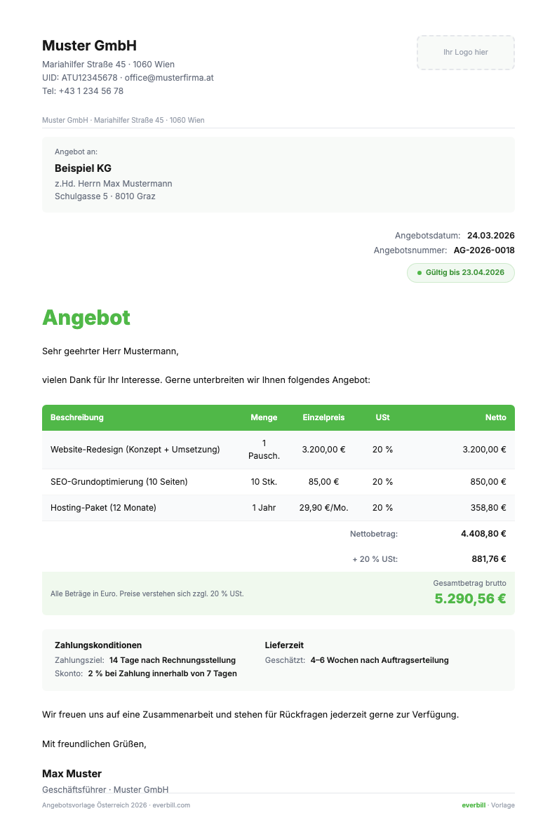 Wenn du USt-pflichtig bist (Umsatz über 55.000 EUR brutto): Ja, du solltest die USt auf dem Angebot separat ausweisen (20 %, 10 % oder 13 % je nach Leistung). Als Kleinunternehmer nach § 6 Abs. 1 Z 27 UStG weist du keine USt aus und vermerkst die Befreiung auf dem Dokument.